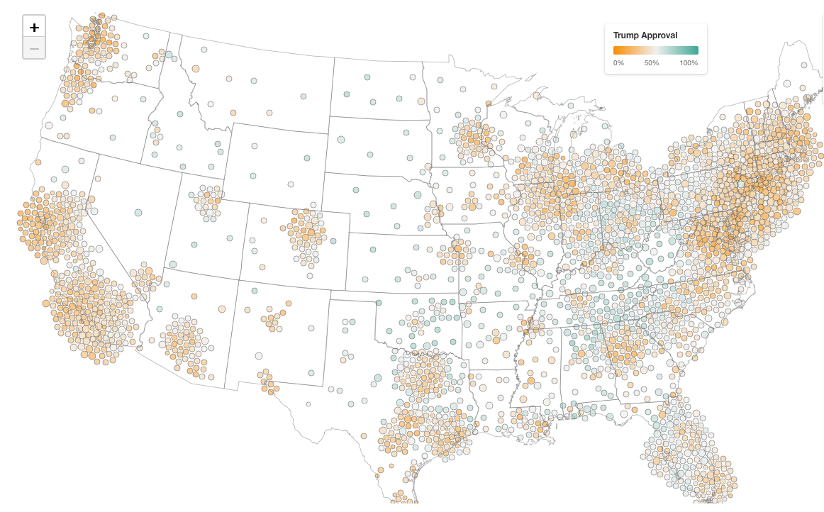 - “A very detailed map of Trump’s job approval” from Strength In Numbers (click to embiggen). “The basic idea is that we fit a model predicting approval based on demographics and geography, then use Census data to weight those predictions by the actual population composition of each area. Election results are used to calibrate estimates to sensible baselines, so we have a real-world check against our survey data. It lets us produce reliable estimates even for places where we only have a handful of direct survey respondents.”