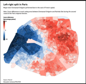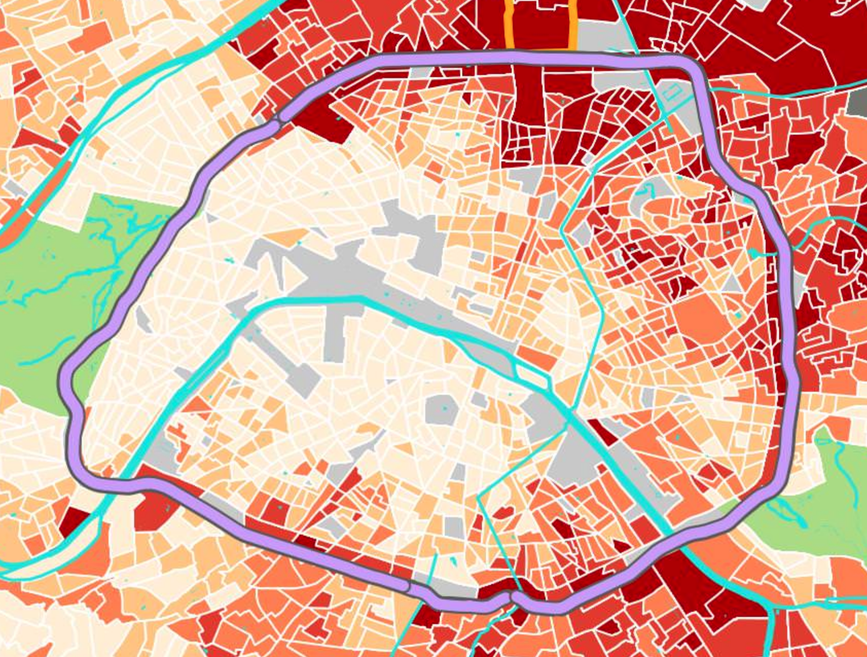 Another useful map is this one from a report on the risk of gentrification in Paris caused by the 2024 Olympics. It’s a map of income: light colours are high income, dark colours are low income.